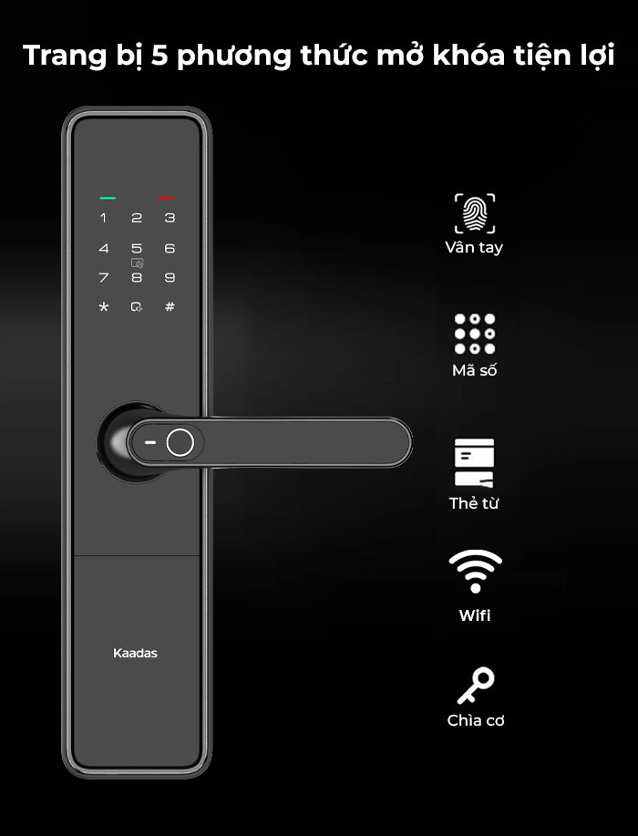 Ngoài các phương thức mở khóa ở phiên bản cũ bao gồm: vân tay, mã số, thẻ từ, chìa cơ. S500-5W được trang bị thêm tính năng kết nối Wifi trên app Kaadas. Mỗi phương thức đều ứng dụng công nghệ hàng đầu hiện nay, đảm bảo an toàn cho ngôi nhà.